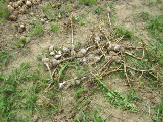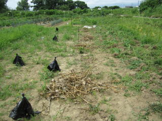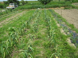 | 雑草取りしながらのニンニク収穫。天気予報ではここ数日、雨降りとのこと。今が最後のチャンス。2021.07.03 9:45 |