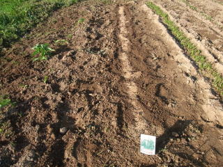 @良く耕した地面に深さ3センチメートル程度に、V字状に溝を掘ります。