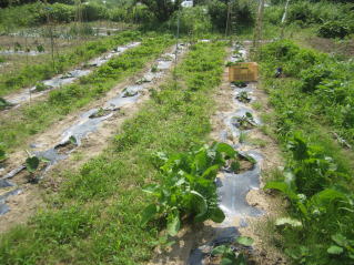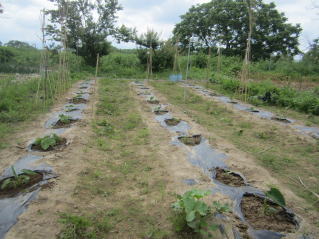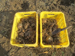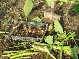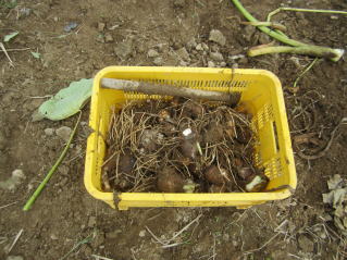 | 山形名物「エモニカイ」(おらホではなまって芋煮会を意味する)のメイン材料となる里芋の栽培方法の紹介です。里芋の苗木はホームセンター1本150円前後と高価です。おらホでもこれまで苗木を購入して栽培していましたが、昨年から種芋から栽培して見事成功し、相応の成果を得ることが出来ました。 定植の準備 よく耕した地面に幅3〜4尺のマルチ(黒い農業用ビニール)を敷き、固定します。マルチの敷き方にはコツがありますが、おらホでは風のない早朝にしています。 定植時期 さすが山形名物「エモニカイ」の古里。昔で言う八百屋と称する所の殆どの店舗で購入することが出来ますが、店毎に仕入れルート が違うようで当たりはずれもあるようです。 おらホでは4月末から八百屋、ホームセンター店頭にナス、キュウリ等ともに種芋が並び始めます。これを買い求めて5月1日前後に定植しています。 定植の仕方 @1畝中約60センチ間隔となるように15センチの深さとなるように穴開け器で穴を開けていきます。 A@に水を注ぎます。 B芽の出る方が上になるよう穴に置き、厚さ5センチくらいになるように周りの土で埋め固定します。 C昨年は、20日前後で芽が出ました。 手入れ 基本的にはほったらかしですが、乾燥には弱いようです。 肥料 芽が出たら第1回目は市販の顆粒状合成肥料をパラパラとかけ周りの土を土を寄せています。(サクヅカゲ) 20センチくらいになったら「尿素」「顆粒状合成肥料」をかけサクヅカゲ 茎落とし(茎の間引き) 8月初旬頃芋の茎、葉が大きくなったら数本残し、残りの茎を間引き切り落とします。切り落とした茎、葉は茎の周りに置き土で埋めます。(肥料になる?昔からそうしています。) マルチ撤去 お盆頃になっったらマルチを撤去し、通気がよくなるようにしています。 ポイント 遅霜の被害を避けるため、土を多めにかけ発芽が遅くなるようにしています。洪水には強いようです。 収穫 9月中旬頃から収穫できました。適宜順次好きなところから収穫していますが、10月下旬には全部収穫し、冬に備え保存します。 調理 ナント言ってもエモニジル(芋煮汁)でしょう。納豆汁、けんちん汁の具にも最適です。イカとドッキングさせての煮っ転がしも結構いけます。 |