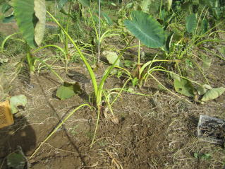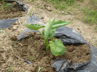 | 里芋独特の葉。35個植え付け中、32個芽出し確認した。2022.05.26 13:29 | 芽出し瞬間?定植後、毎日水をかけてきた。2022.05.26 13:29 | ||||||||||||||||||||||||||