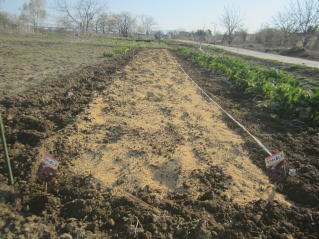今回は種の蒔き方をスジ蒔きし、これを手のひらで軽く叩き種を固定してみた。 |