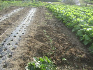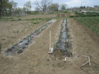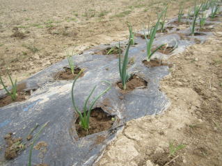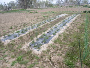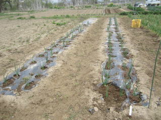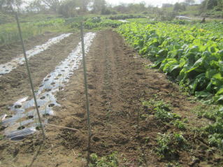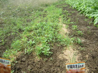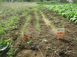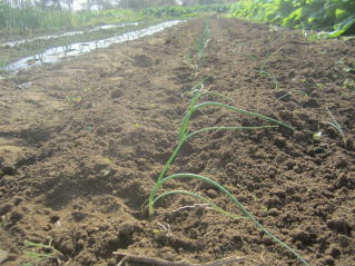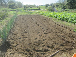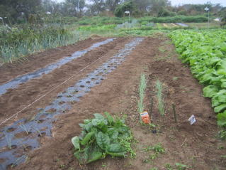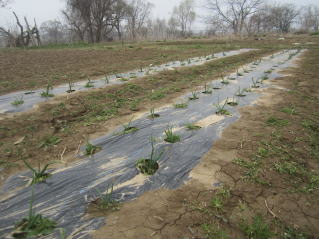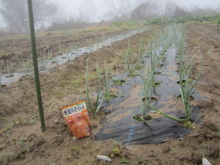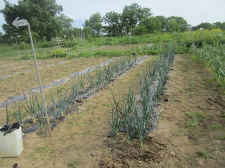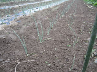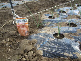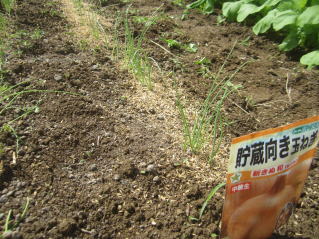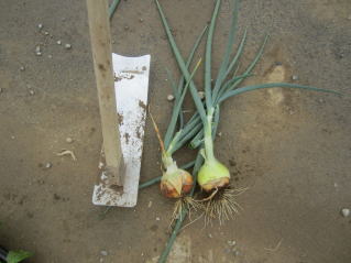 | タマネギはホームセンターで苗として売っているようですがコスト高。おらホでは秋に種を蒔いて苗を作り、定植します。収穫は翌年6月頃です。 種まき 蒔き時 例年9月1日前後にしている。人によってはポットに種を蒔き適当な大きさ(つまようじくらいの太さ、大きさ)になってから移植するが、おらホでは家庭菜園内で苗を作ってきた。 割り箸くらいの太さになってから定植している。 蒔き方 @良く耕した地面に高さ15センチ、幅45センチほどの床を作ります。 Aこの床に深さ3センチほどの溝を3本切ります。 Bここに1粒づつ種を筋蒔き風に置いていきます。この時まだ土を上掛けしません。 C買い求めた種の残り具合を確かめ、残っていたら適当に蒔き、足りないようだっらB種を拾い集め適宜蒔いていきます。 D土をかけてからその上に籾殻を籾殻を蒔きます。 ポイント 出来るだけ均等に薄く蒔き、間引きしないように心がけています。 手入れ 肥料 芽が出たら顆粒状肥料、尿素を蒔いています。ネギ類は肥料を与えた分だけ大きくなるようです。 雑草取り 雑草取りはマメにしなければなりません。 定植 準備作業 @良く耕した地面に尿素、油かすなど均等に降り、更に良く耕し数日間放置しておきます。 Aマルチ(黒いビニール)を敷き、固定します。これをまた、数日間程度放置しておきます。 定植 @穴開け器しい1畝3列、15〜20センチ間隔となるようにとなるように穴を開けていきます。 A1本ずつ苗を植えていきます。 定植後の手入れ 肥料 ネギ類は肥料を好むとありましたので、顆粒状肥料、尿素を2回ほど投入しています。おらホでいうサクヅカゲです。 収穫 例年6月中下旬頃でしょうか。適当な大きさのものから適宜収穫していきます。 |