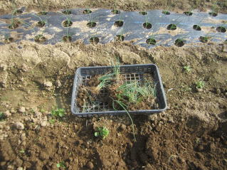 | 1畝、定植完了。右、タマネギ苗。2023.10.15 7:01 | 一寸小さめ?先ずは良し。1畝植えたところで降雨。今日はこれまで。2023.10.15 7:01. | ||||||||||||||||||||||||||