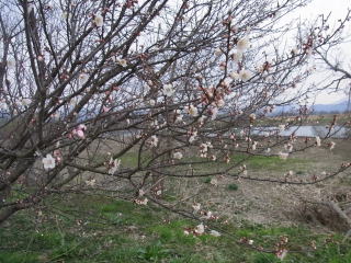 左小ウメ3分咲き。右・豊後梅1分咲き。春は通り過ぎていくようです。 2011.04.24 12:01 撮影