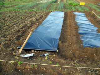 黒ビニルで地面を覆うことで光合成されなくなり、雑草退治にも効果あるようである。不手際で畑が雑草一面になった箇所をあえてマルチングし、そこにナス、キュウリ、里芋等を植えている。