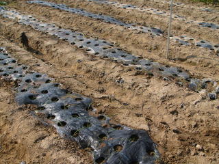 タマネギの定植のためのマルチ床、スペースが余ったのでタマネギ苗の全部定植を行った。苗木の数は約200本。ホームセンターから購入したものである。20数本で248円であった。これだけのタマネギを栽培すれば1年間は優に間に合うはずだ。