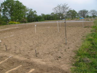 手前オカヒジキ、奥小松菜、4、5列目姫大根白、奥同赤で