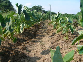 ちょっと遅めであったが里芋のマルチは剥がしをした。里芋は雑草に覆われていたので雑草取りから始まった。マルチを剥がした後、尿素