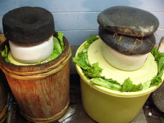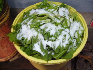 葉が橙色に変わり、食べても苦みが出てくる。漬け方は極めて簡単。大樽に青菜を入れ、塩をまぶし重石を置いて完了。数時間もすると
