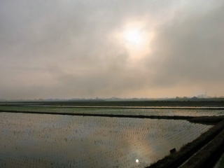 朝もやの日の出風景です。田圃にはいつの間にか水が張ら