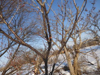 2月にもかかわらず梅の花のつぼみを確認することができた。梅剪定の時期としては今が最後かもしれない。