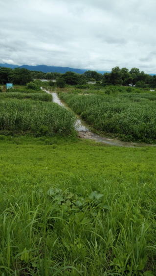 | ほんとに増水する時は、左上青いビニルハウスが水没する。2020.0716 13:00 | キュウリの葉が泥をかぶっている。2020.07.16 17:54 |