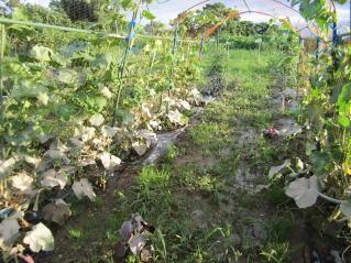 | 洪水にならないだろうと高をくくっていたら、「水があがった」とのメール連絡。これはまずい。 帰宅後、さっそく下見。キュウリの状況を見ると30センチほど冠水した模様。幸い水は引いていたが、ぬかるんで1週間は農作業は無理だろう。 |