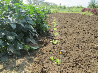 | 目出し後、間引き作業が待っている。2021.09.23 2021.0920 11:49 | 白菜定植。左は秘伝豆。2021.09.23 10:49 |