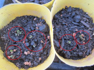 | まさかの霜害。行楽に歓迎の晴天、この時期は霜害の心配となる。これが現実となった。 しかし最小限の被害となった模様。ここ10年の天候が数十年前の状況と異なっていることは確実である。 霜害を覚悟してのサツマイモ定植を行った。 キャベツの芽出しを確認。 |