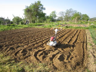 | 里芋植え付け箇所の耕耘。2024.04.28 7:05 | マルチ張り。2024.04.28 7:54 |