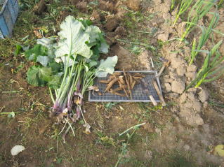 | 里芋植え付け完了。クキタチナ箇所耕耘。昨シーズン放置箇所の雑草取り。春ゴボウ収穫。 | |