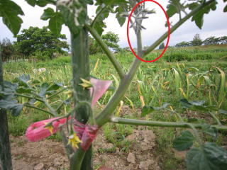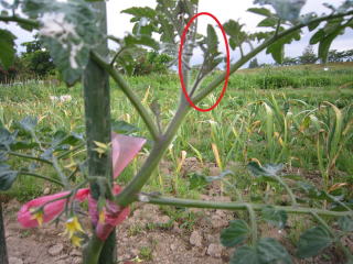 | トマト脇芽。2024.06.11 5:15 | 脇芽を摘み取る。2024.06.11 5:18 |