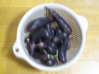| ナスが生き延びている。オレジの花は油虫除け用の松前菊。2024.08.24 7:20 | ナス収穫。2024.08.24 18:00 |