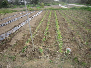 | 種蒔きが9月下旬、苗が小さい。しかし、この機を逃せない。2024.10.26 10:50 | マルチに穴を開け、1本ずつ定植。2024.10.26 10:50 |