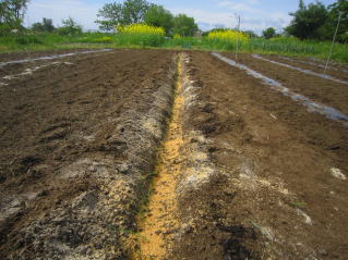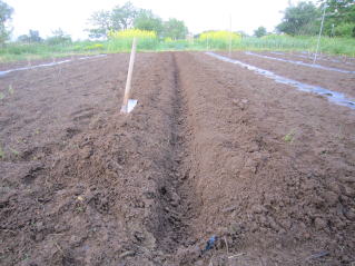 | もう少し太めが良いかもしれないが、時間がないのでこれで定植。2025.05.18 5:54 | 深さ10センチ程度の溝を切る。2025.05.18 5:54 |