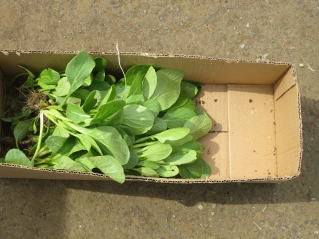 | 多くくなってきたコマツナ。2025.05.18 9:05 | コマツナ、間引き収穫。2025.05.18 9:09 |