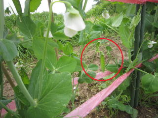 | 5月31日深夜からの雨天の天気予報。この雨、雑草達にも恵みの雨となるので、雑草取りをしなければならない。 サヤエンドウの実を確認。季節は進んでいる。 |