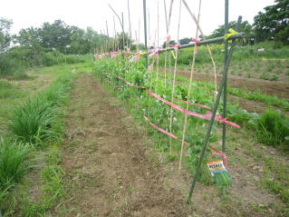 | サヤエンドウ、2回目ものビニルテープエスコート。2025.05.31 11:37 | サヤエンドウの実確認。2025.06.01 11:37 |