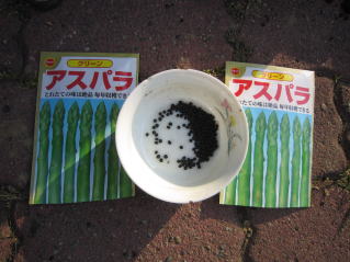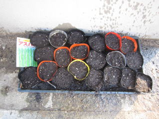 | 早朝の下見、水かけ。秘伝豆発芽確認。アスパラのポット種蒔き。 | |