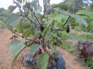 | 連術水かけをしている里芋。元気が良い。2025.07.09 5:16 | ナス、実をつけている。2025.07.09 5:16 |