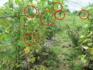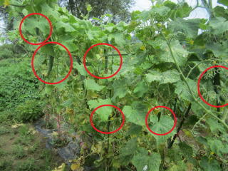 | 雨が降ってキュウリが元気回復?頑張って実をつけている。2025.08.11 11:45 | 全部で20本ほど。2025.08.11 11:45 |