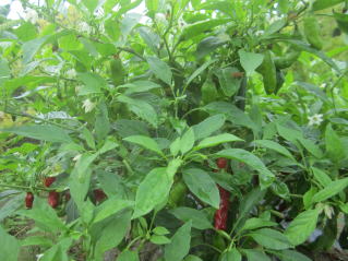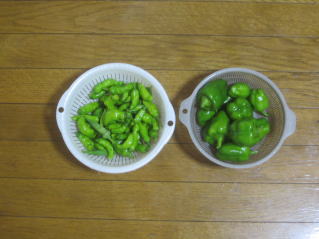 | いつの間にか花が咲きだしたピーマン。2025.09.20 9:45. | 左シシトウ、右ピーマン。2025.09.20 12:40 |