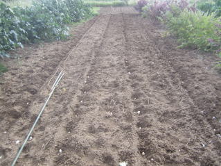 | ニンニク片を訳20-30センチ間隔で仮置き。2025.09.21 15:07 | 土、もみ殻を置いて作業完了。2025.09.21 15:41 |