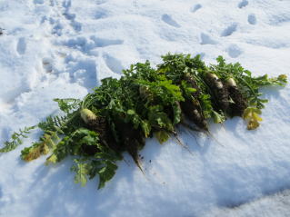 | 雪中大根、ネギ収穫. |