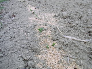 土をかけもみ殻を蒔きます。もみ殻は目印にもなるし、種を