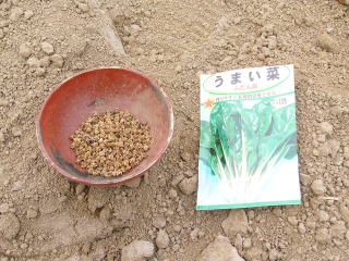 Aここにパラパラと筋まきふうに蒔いていきます。春菊のような種なので蒔きやすいです。
