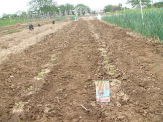 @良く耕した地面に15センチ間隔に直径15センチ、深さ数センチ程度の窪みを掘ります。この時底を出来るだけ平にします。