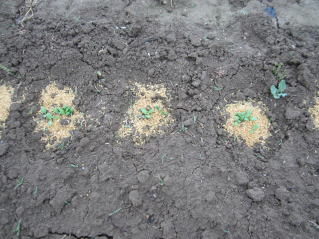 @良く耕した地面に15センチ間隔に直径15センチ、深さ数センチ程度の窪みを掘ります。この時底を出来るだけ平にします。