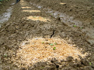 B軽く土をかけ、この上に籾殻を蒔きます。籾殻は土の固定と保水の効果があるようです。
