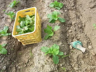 1株に数本の苗が密集しています。これを丁寧に1本にしていきます。ちなみにコンテナは収穫した間引き白菜。即席漬けものにして