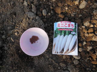 種袋の後ろを見ると蒔き時というのはないようだが、6月以降になると他の美味しい野菜が取れ始めるので「野菜に飢えている時期」に限定して栽培している。夏蒔きするとアッと言う間に「お化けミニ大根」になるので気を許せない。