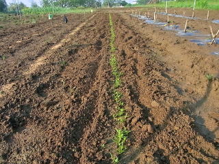 @溝の底はできるだけ平面にしています。凹凸のある所に種が蒔かれ土をかけると、かけられた土の厚さが一定でなくなり、発芽しなかったり、発芽が早いものと遅いものが出てアンバランスとなります。