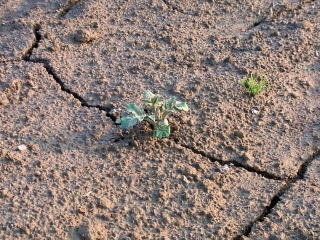 地面を割るように濃い緑色の販の芽がボッと出てきます。例年、植付けしてから7〜10日間で発芽しています。