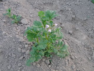 ジャガイモの花、発見。左上の葉っぱもジャガイモ。生長に