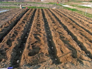 Bこの溝に約45pおきに芽が上向きになるように種芋を置いていきます。この時まだ土をかけません。