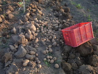 茎が枯れた頃を見計らって発掘します。どこに埋まっているか分かりませんので遠目から桑を入れていきます。収穫は楽しいですが結構重労働です。