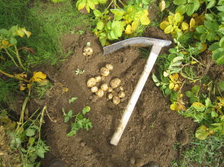 茎が枯れた頃を見計らって発掘します。どこに埋まっているか分かりませんので遠目から桑を入れていきます。収穫は楽しいですが結構重労働です。