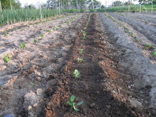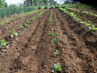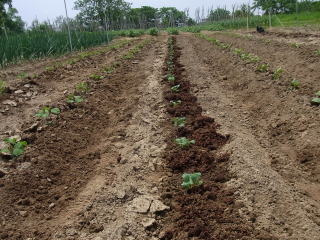 キャベツ活き付きました、定植成功です。黒く見えるのは牛糞