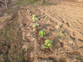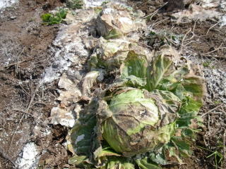 雪解け直後の越冬キャベツ。移植をする予定です。