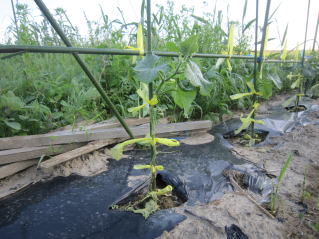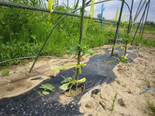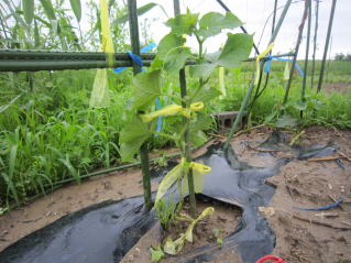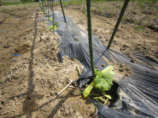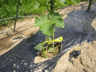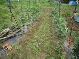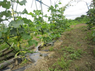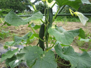 | 定植の準備 @よく耕した地面に幅3〜4尺のマルチ(黒い農業用ビニール)を敷き、固定します。マルチの敷き方にはコツがありますが、おらホでは風のない早朝にしています。 A定植前に支柱、ネットをかけます。 定植時期 おらホでは4月末からホームセンター店頭にナス、キュウリ等ともに苗が並び始めます。これを買い求めて5月1日前後に定植しています。おらホでは洪水被害のリスクがあるので、接ぎ木でない安価なもの「70円」程度を20本ほど購入しております。 キュウリは洪水に当たると一発でアウトです。 定植の仕方 @1畝中約90センチ間隔となるようにネットの外に穴開け器で穴を開けていきます。 A@に水を注ぎます。 B苗ポットから苗を取り出し、Aに苗を入れ土で埋め固定します。 C風で倒れないように支柱を当てます。(おらホでは周りにあるヨシを適当な長さに切って利用していますが、細めの市販のイボ竹を使ってもよいでしょう。)ある程度大きくなったらイボ竹を支柱とします。 手入れ ナント言っても整枝だと思います。先にも描きましたが、まだマスターしていません。専門書等を見ながら、今年はチャレンジです。 支柱 ネットに這うまで支柱を立てますが、結わえ付けるのに折れたり、傷つけないようにしております。 整枝 マスターしていないので、これに関しては専門技術書、HPがありますで詳細はそちらを参考にしてください。 肥料 第1回目は5月下旬頃、後は適宜市販の顆粒状合成肥料をパラパラとかけ土を寄せています。(サクヅカゲ) 後は適宜「尿素」を与えます。 害虫対策 おらホではアブラムシが付くようです。確認したら、市販の農薬で噴霧消毒します。 ポイント 長期間収穫するには、やはり整枝だと思います。 収穫 6月中旬頃、初物をゲット出来ます。 調理 漬け物、茄子焼き等一般的な食べ方をしていますが、今年は黒味噌漬けできるくらい大量収穫できるよう張り切っています。 収穫 6月中旬頃、初物をゲット出来ます。 調理 漬け物、茄子焼き等一般的な食べ方をしていますが、「ペソラヅケ」をマスターしました。 |